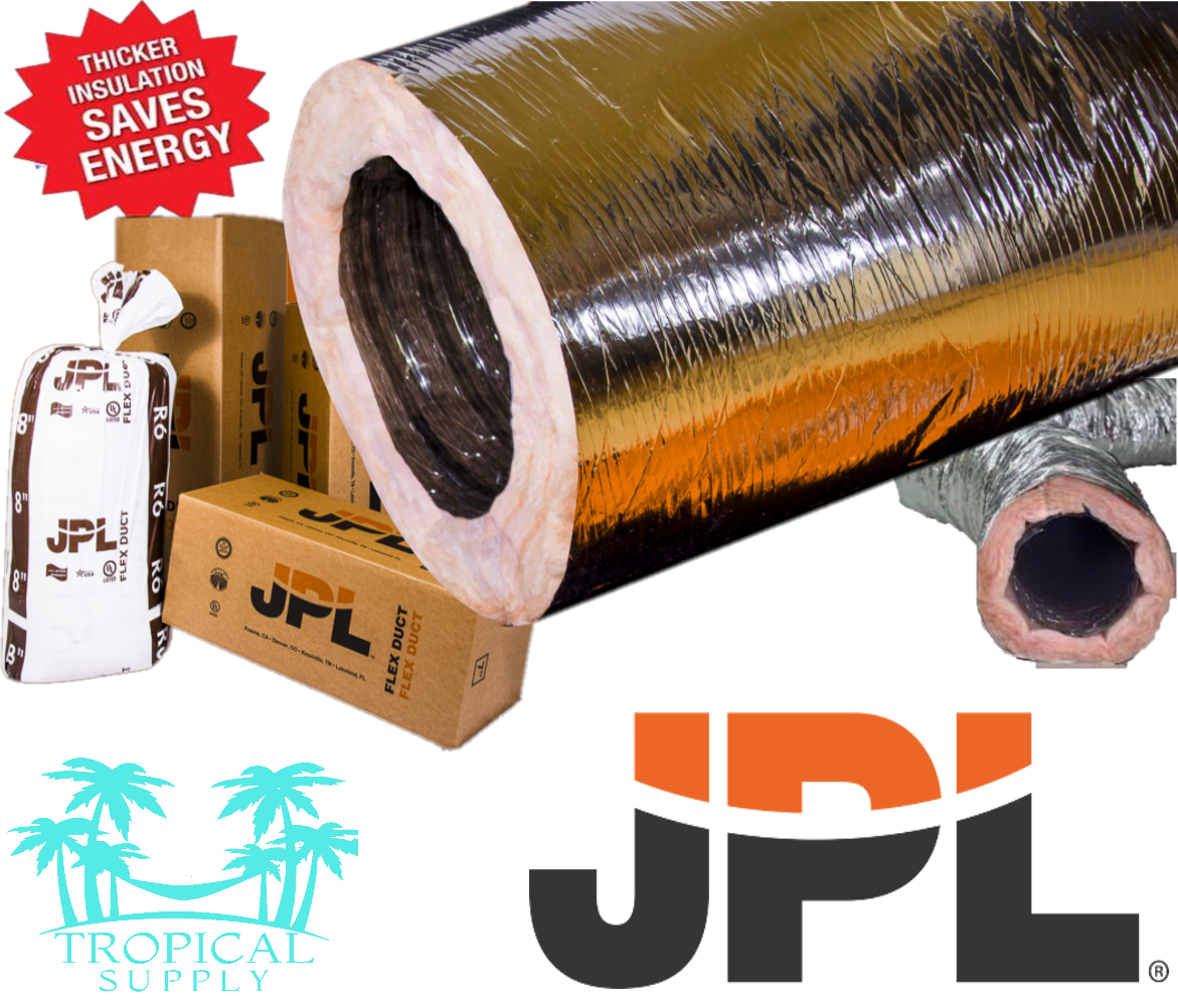 Fiberglass insulation 10 Year limited warranty choices of R4.2, R6 & R8 encompass the core and GREENGUARD Gold Certification a unique metalized, reinforced vapor barrier Formaldehyde free (see www.jplflex.com for more info) surrounds the entire duct. 3/8” oversize inner core Certified R-Values